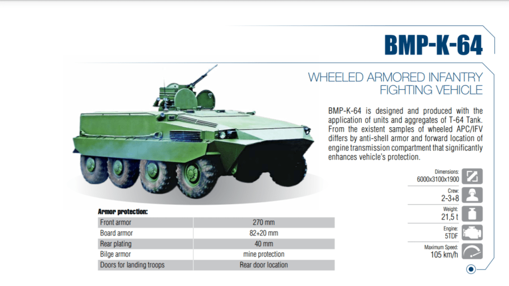 Then there’s the BMP-K-64, using the tank chassis for a wheeled APC. I find it simultaneously weird, interesting, questionable, and somehow impressive. This would be used like any other Stryker/BTR-style wheeled troop carrier, albeit with its thick front armor taken into account.