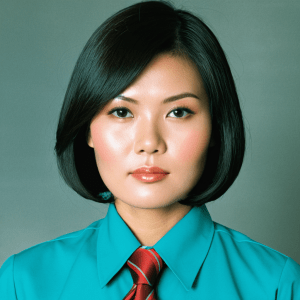 So with the only cues being “short hair in some kind of bob” and “glasses”, I turned to prompting various Stable Diffusion models. Claire tends to wear grey working clothes and in her anime depictions has orange eyes.