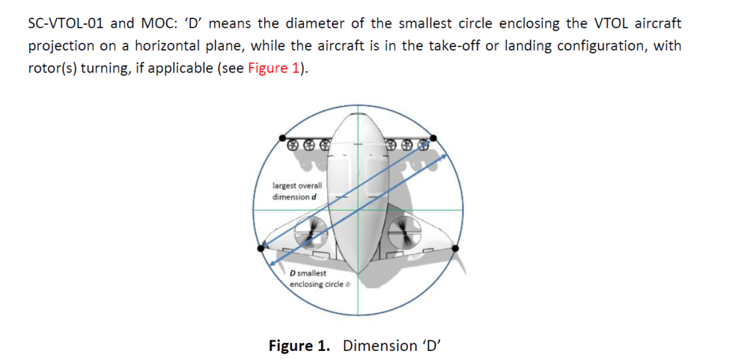 The second is an EASA draft regulation on “vertiports”. The “D” value is defined a circle around the aircraft when its thrusters are in takeoff/landing mode.